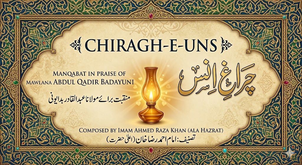 Chiragh-e-Uns Alahazrat Imam Ahmed Raza Khan ka wo mufid manzoom kalām hai jo aap ne Mawlana Abdul Qadir Badayuni ki shaan-e-aqdas mein pesh kiya. Ye manqabat na sirf Alahazrat ki be-misal shairi aur zaban-o-bayan par uboor ka saboot hai, balkay ye us gehray roohani talluq ko bhi zahir karti hai jo aap ko apne mo’tabar buzurgon se tha. “Chiragh-e-Uns” ka matlab hai “Mohabbat ka Chiragh,” aur ye waqai dilon mein buzurgane-deen ki mohabbat aur aqeedat ki roshni peda karta hai. Aap ki website ke liye ye tasneef ek aisa ilmi tohfa hai jo Alahazrat ki ilmi sakhti ke saath saath unki narm-mizaji aur aqeedat-mandi ko bhi pesh karta hai.